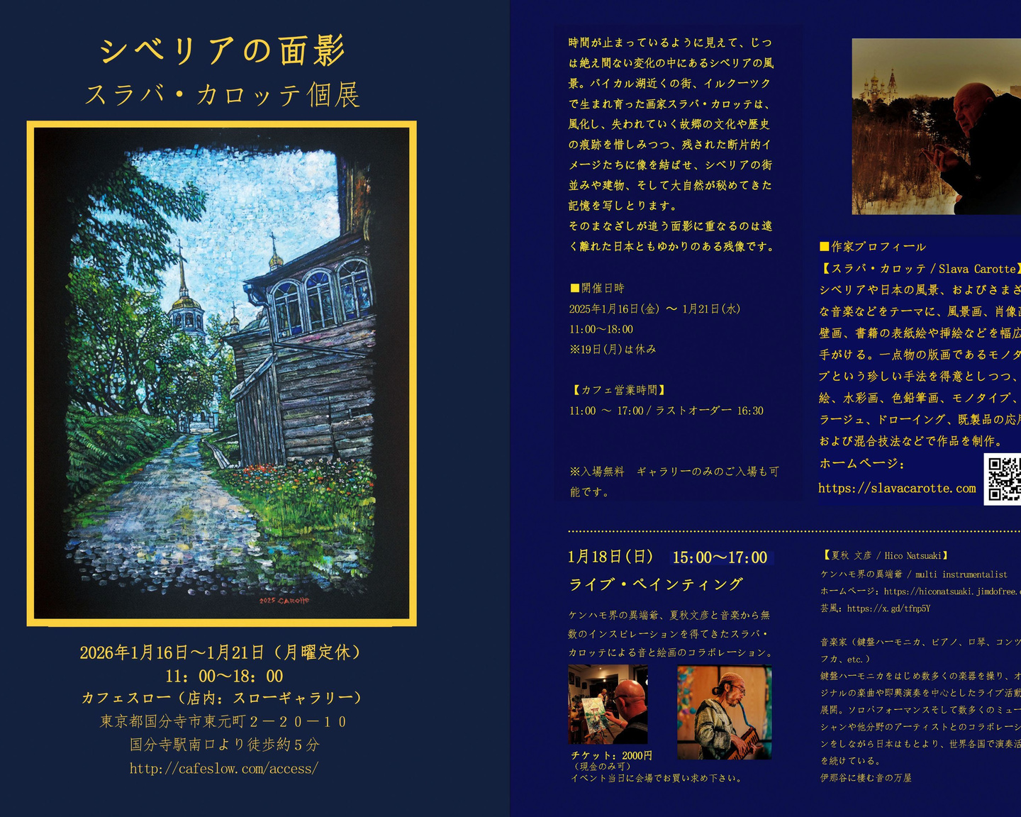 時間が止まっているように見えて、じつは絶え間ない変化の中にあるシベリアの風景。 バイカル湖近くの街、イルクーツクで生まれ育った画家スラバ・カロッテは、風化し、失われていく故郷の文化や歴史の痕跡を惜しみつつ、残された断片的イメージたちに像を結ばせ、シベリアの街並みや建物、そして大自然が秘めてきた記憶を写しとります。